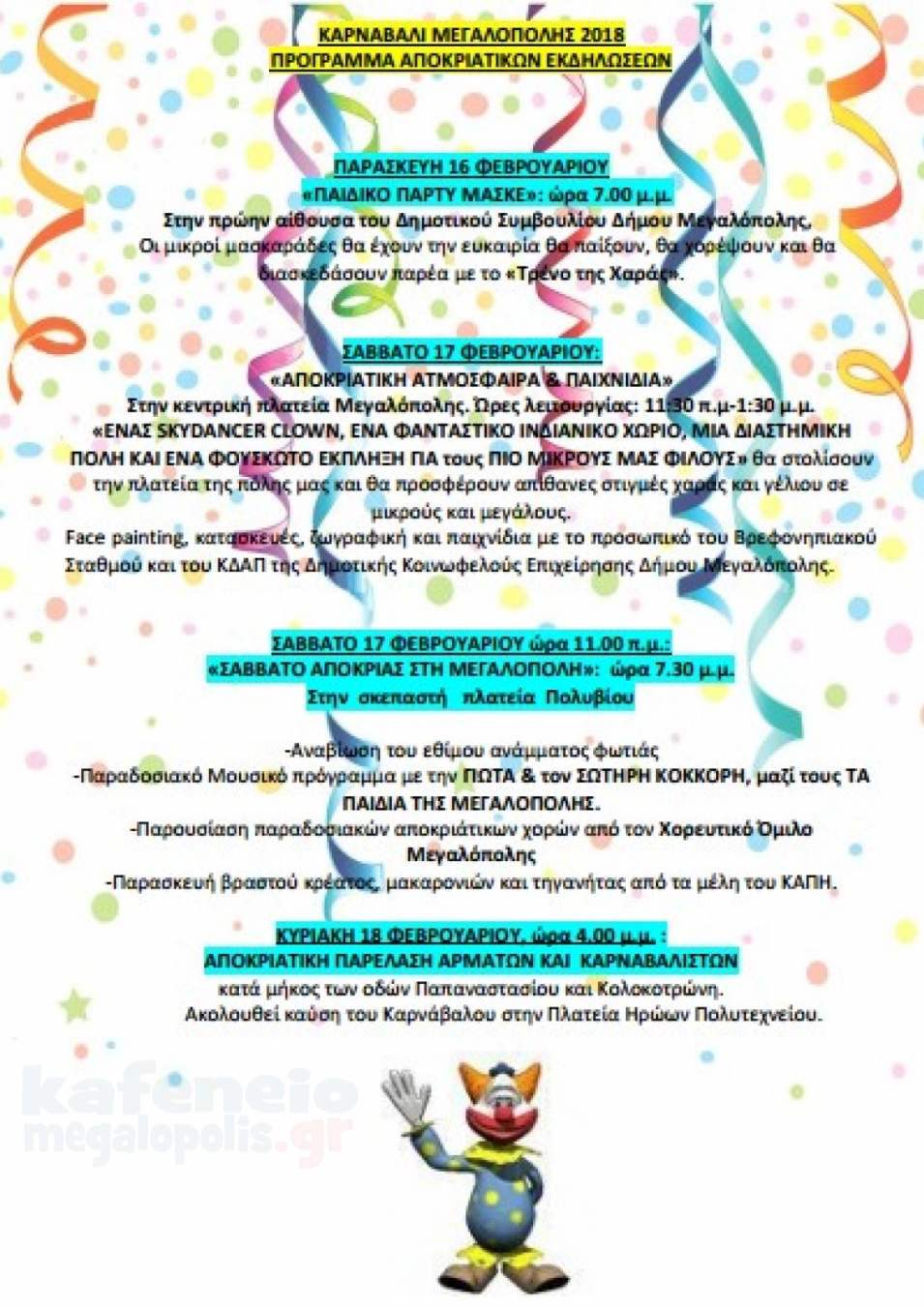 Αναρτήθηκε στην ιστοσελίδα του Δήμου Μεγαλόπολης , το πρόγραμμα των Αποκριάτικων Εκδηλώσεων που θα γίνουν από την Παρασκευή 16 Φεβρουαρίου έως και την Κυριακή 18 Φεβρουαρίου που είναι η μέρα της Καρναβαλικής παρέλασης στην κεντρική πλατεία.