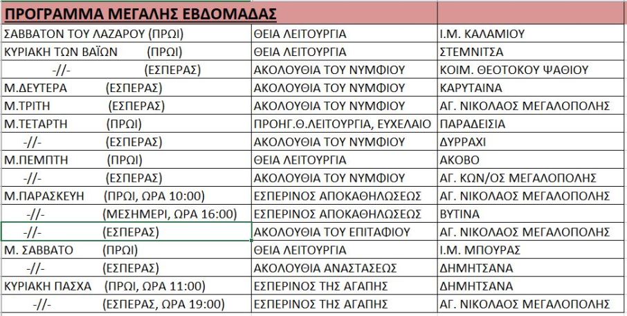 Πρόγραμμα Αρχιερατικών Χοροστασιών και Θείων Λειτουργιών της Μεγάλης Εβδομάδας του Σεβασμιωτάτου Μητροπολίτη Γόρτυνος και Μεγαλοπόλεως κ.κ. Νικηφόρου