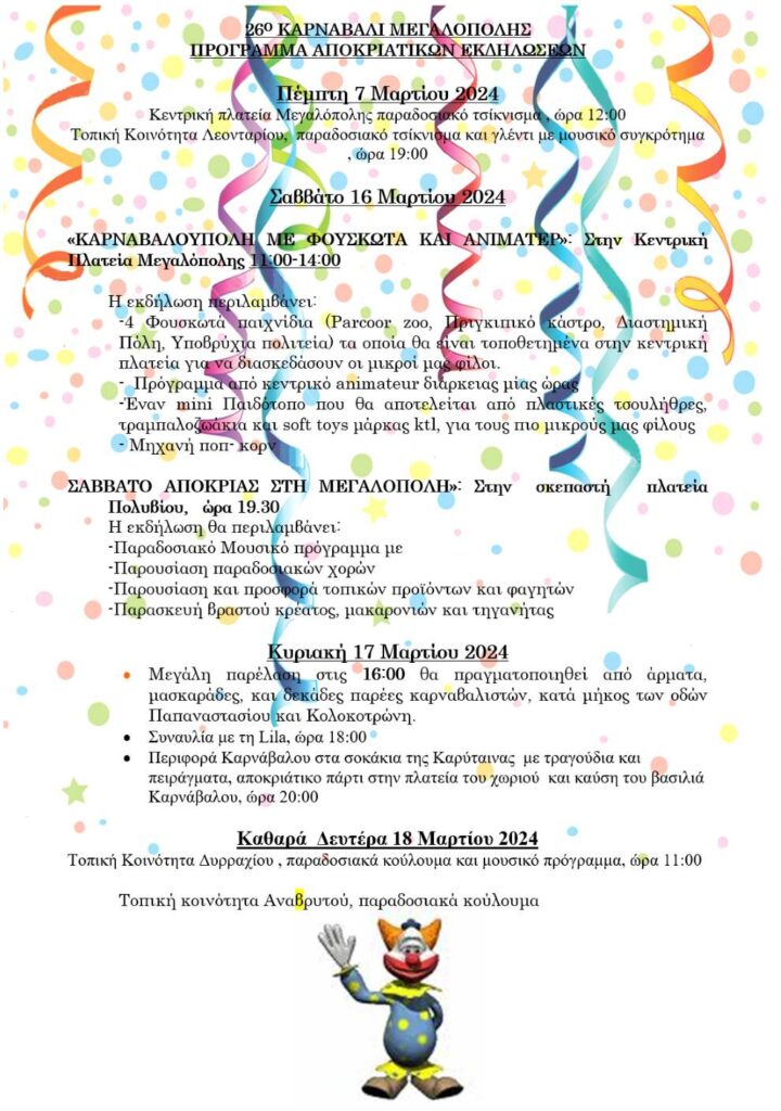 Ο Δήμος Μεγαλόπολης διοργανώνει και φέτος το «Καρναβάλι Μεγαλόπολης 2024».