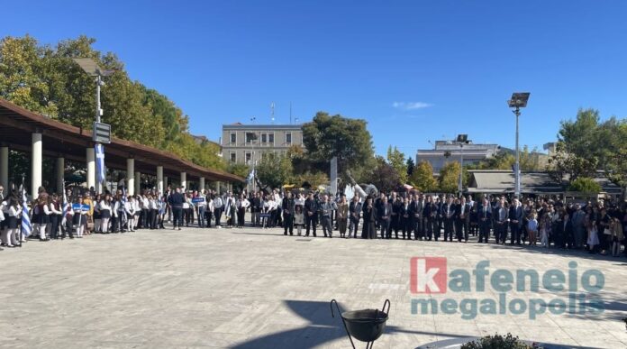 β. Ώρα 12:00 Θα ψαλεί Τρισάγιο υπέρ αναπαύσεως των ψυχών των αγωνιστών/ηρώων του 1940 και θα λάβει χώρα στην Κεντρική Πλατεία κατάθεση στεφάνων από μαθητές και μαθήτριες των Σχολείων Α/θμιας και Β/θμιας Εκπαίδευσης. Τιμές θα αποδώσει η Φιλαρμονική Μεγαλόπολης (Σε περίπτωση ματαίωσης λόγω καιρικών συνθηκών, η κατάθεση στεφάνων των σχολείων θα υπαχθεί στο Πρόγραμμα της 28ης Οκτωβρίου).
