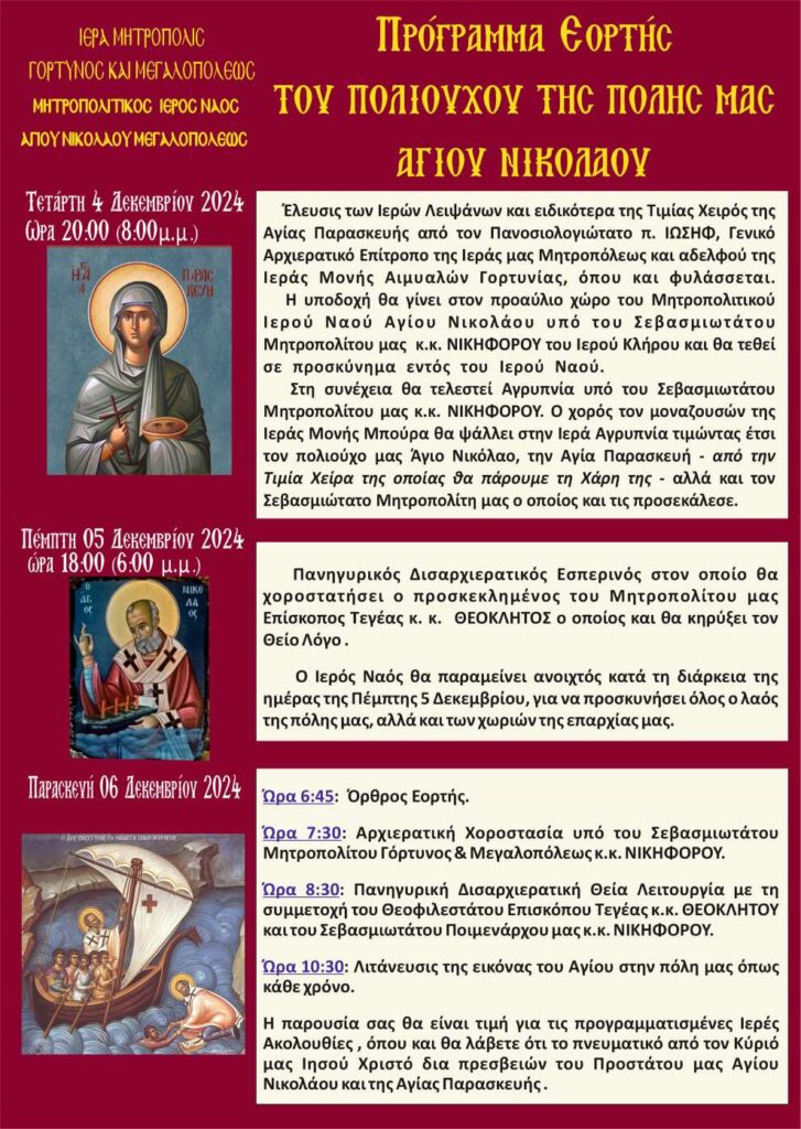 Ο Μητροπολίτης Γόρτυνος & Μεγαλοπόλεως και ο Δήμαρχος Μεγαλόπολης σας προσκαλούν να τιμήσετε με την παρουσία σας τον εορτασμό του πολιούχου μας Αγίου Νικολάου, στις 6 Δεκεμβρίου 2024.