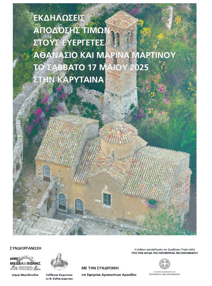 Με τις ευχές του Σεβασμιωτάτου Μητροπολίτη Γόρτυνος και Μεγαλοπόλεως ΚΚ ΝΙΚΗΦΟΡΟΥ, ο Δήμος της Μεγαλόπολης και ο Σύλλογος των Καρυτινών «ο Θ. Κολοκοτρώνης», σας προσκαλούν να τιμήσετε με την παρουσία σας τις εκδηλώσεις απόδοσης τιμών στους Ευεργέτες του Δήμου μας ΑΘΑΝΑΣΙΟ ΚΑΙ ΜΑΡΙΝΑ ΜΑΡΤΙΝΟΥ, που θα πραγματοποιηθούν στην Καρύταινα ΤΟ ΣΑΒΒΑΤΟ 17 ΜΑΪΟΥ 2025.