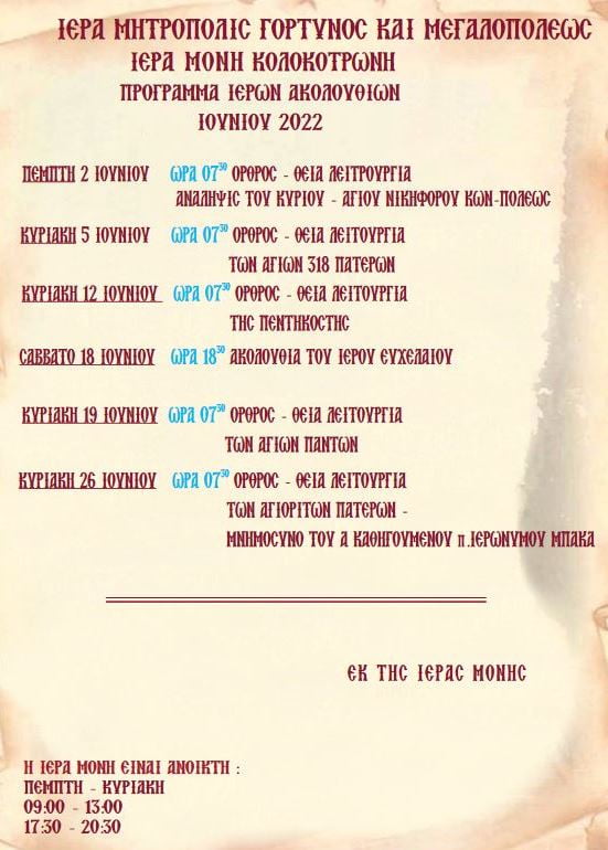 Από την Ιερά Μονή Παναγίας Κολοκοτρώνη στην Εκκλησούλα Μεγαλόπολης, ανακοινώνεται το πρόγραμμα Ιερών Ακολουθιών για τον Ιούνιο 2022