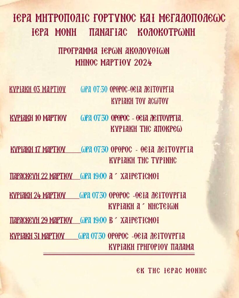 Από την Ιερά Μονή Παναγίας Κολοκοτρώνη στην Εκκλησούλα Μεγαλόπολης, ανακοινώνεται το πρόγραμμα Ιερών Ακολουθιών για τον Μάρτιο 2024