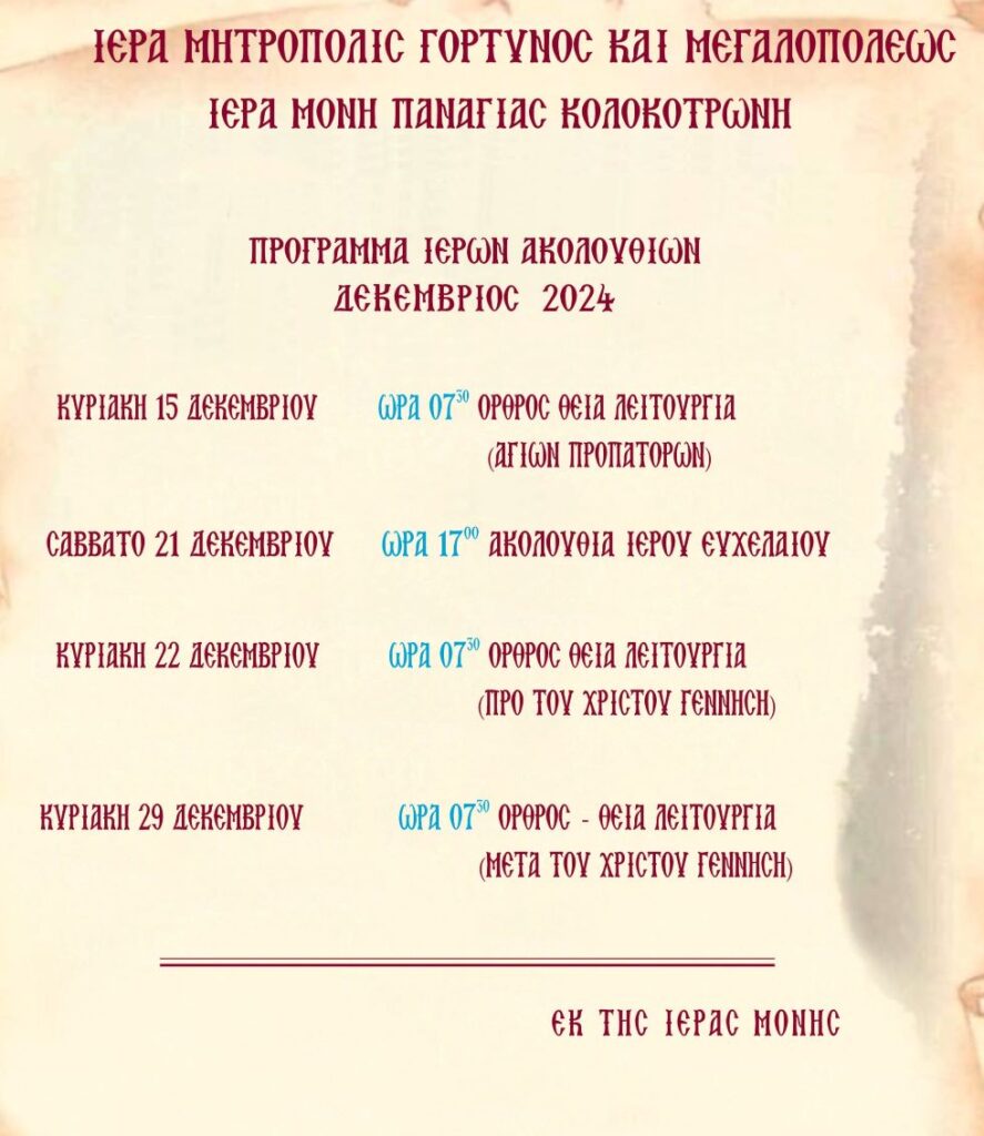 Από την  Ιερά Μονή Παναγίας Κολοκοτρώνη στην Εκκλησούλα Μεγαλόπολης, ανακοινώνεται το πρόγραμμα Ιερών Ακολουθιών για τον μήνα Δεκέμβριο 2024.