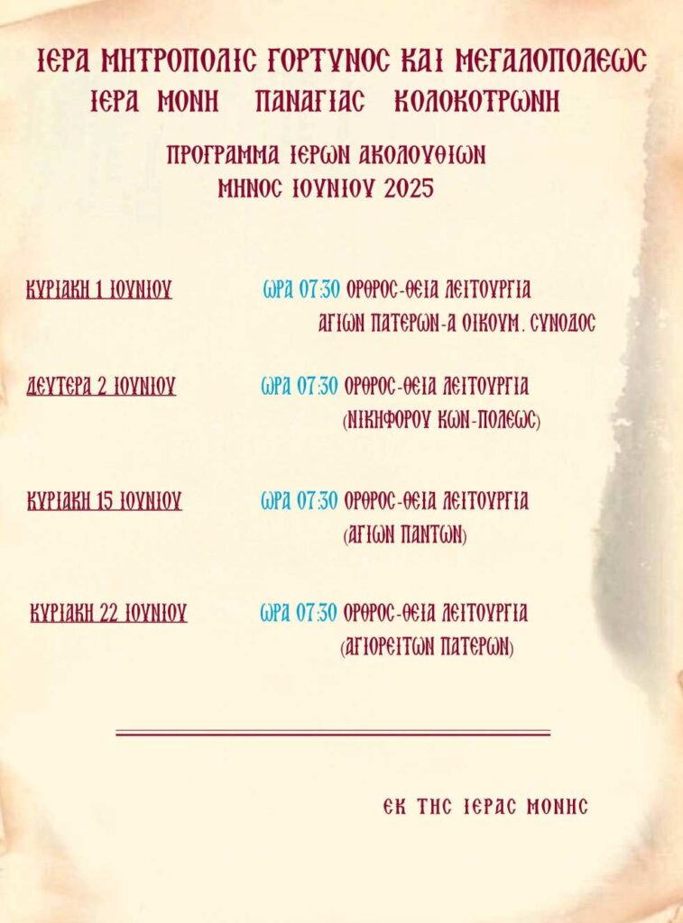 Από την Ιερά Μονή Παναγίας Κολοκοτρώνη στην Εκκλησούλα Μεγαλόπολης, ανακοινώνεται το πρόγραμμα Ιερών Ακολουθιών για τον μήνα Ιούνιο 2025
