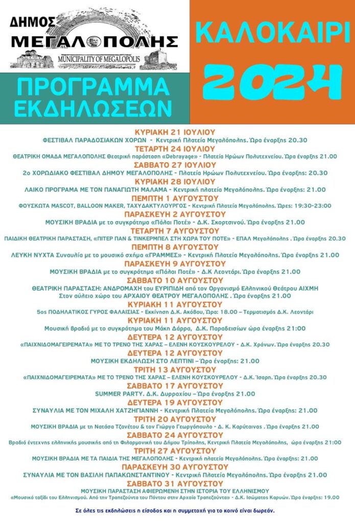Η έναρξη του Πολιτιστικού Καλοκαιριού 2024 θα γίνει με το 12ο Φεστιβάλ Παραδοσιακών Χορών την Κυριακή 21/7/2024 και ώρα στις 20:30 στην Κεντρική Πλατεία Μεγαλόπολης, όπου συμμετέχουν: