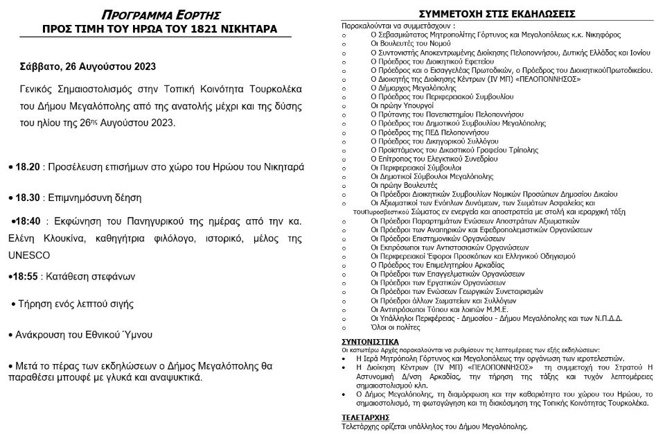 Σας προσκαλούμε να τιμήσετε με την παρουσία σας τις εκδηλώσεις της Εορτής προς τιμή του Ήρωα του 1821 ΝΙΚΗΤΑΡΑ, που θα γίνουν την 26η Αυγούστου 2023 στην Τοπική Κοινότητα Τουρκολέκα του Δήμου Μεγαλόπολης σύμφωνα με το συνημμένο πρόγραμμα.