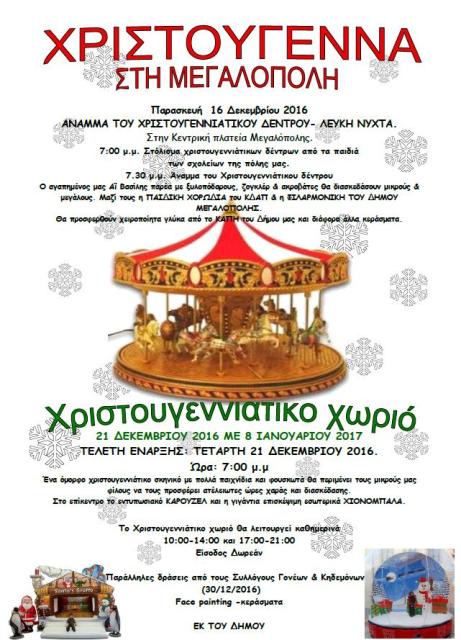 Όπως κάθε χρόνο, έτσι και φέτος, ο Δήμος της Μεγαλόπολης, διοργανώνει εορταστικό πρόγραμμα Χριστουγέννων, με διάφορες εκδηλώσεις.