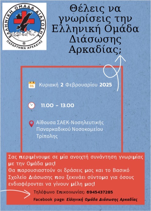 Η Ελληνική Ομάδα Διάσωσης Αρκαδίας σας προσκαλεί την Κυριακή 2 Φεβρουαρίου και ώρα 11.00-13.00, στην αίθουσα ΣΑΕΚ-Νοσηλευτικής του Παναρκαδικού Νοσοκομείου Τρίπολης, για μία ανοιχτή παρουσίαση της ομάδας μας.