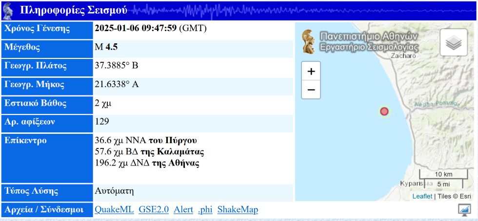 Συγκεκριμένα η δόνηση είχε εστιακό βάθος 5 χλμ. και επίκεντρο 3 χλμ. από το Γιαννιτσοχώρι Ηλείας.