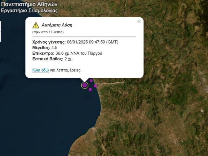 Συγκεκριμένα η δόνηση είχε εστιακό βάθος 5 χλμ. και επίκεντρο 3 χλμ. από το Γιαννιτσοχώρι Ηλείας.