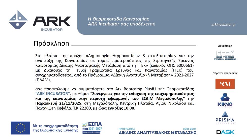 O Συνεργατικός Χώρος Εργασίας ARK Coworking Space σε συνεργασία με τη Θερμοκοιτίδα Καινοτομίας ARK Incubator διοργανώνουν τη διεξαγωγή συμπληρωματικών εργαστηρίων συν-δημιουργίας (bootcamp) στην Τρίπολη και τη Μεγαλόπολη την Παρασκευή 21 Νοεμβρίου 2025 για την ανάδειξη των προτεραιοτήτων των επιχειρήσεων στην ανάπτυξη και διαχείριση της καινοτομίας, τη διερεύνηση συνεργασιών για την υποστήριξη ερευνητικών και επενδυτικών δράσεων και την αξιοποίηση χρηματοδοτικών εργαλείων.