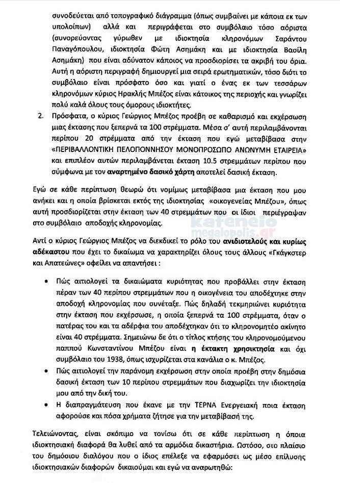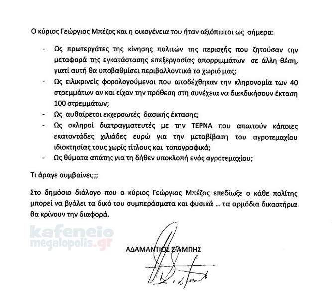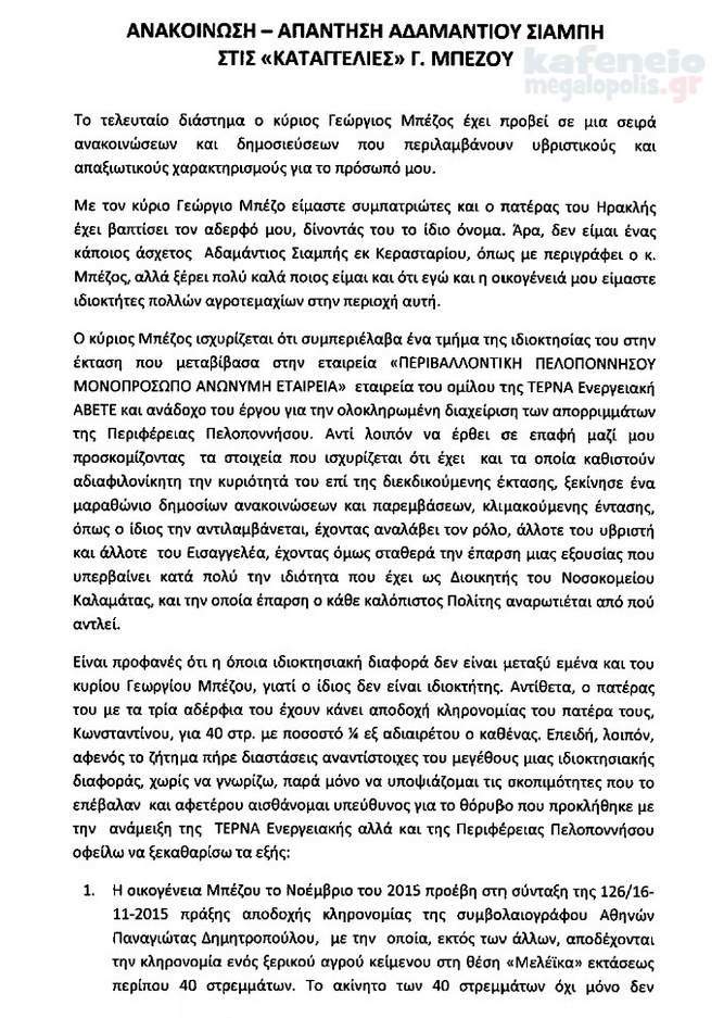 Ο κ. Αδαμάντιος Σιαμπής με επιστολή του προς τα μέσα ενημέρωσης απαντά στα λεγόμενα του κ. Μπέζου και στρέφει αιχμές και ερωτήσεις στο πρόσωπό του: