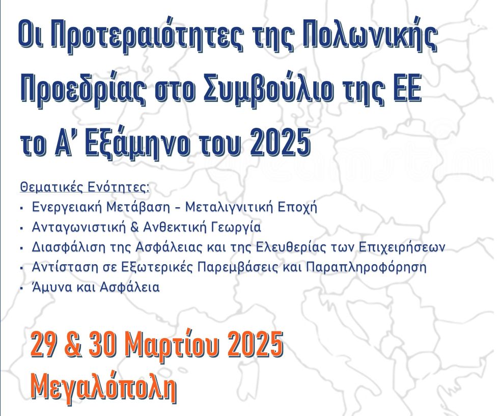 Ο Δήμος Μεγαλόπολης σε συνεργασία με την ΑΡΚΑΔΙΑ ΑΕ και τον Ευρωπαϊκό Οργανισμό Στρατηγικού Σχεδιασμού, διοργανώνουν συνδιάσκεψη με θέμα «Οι Προτεραιότητες της Πολωνικής Προεδρίας στο Συμβούλιο της ΕΕ το πρώτο εξάμηνο του 2025».