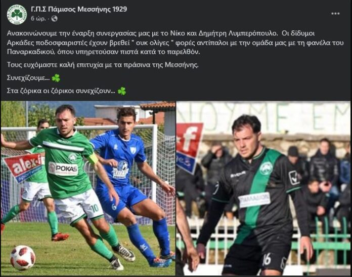 Τα αδέρφια Νίκος και Δημήτρης Λυμπερόπουλος θα συνεχίσουν την μεγάλη ποδοσφαιρική τους καριέρα στον Πάμισο Μεσσήνης, όπως έκανε γνωστό η ομάδα με ανακοίνωσή τους το μεσημέρι της Τετάρτης (23/7).