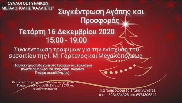 Ο Σύλλογος Γυναικών Μεγαλόπολης “ΚΑΛΛΙΣΤΩ”, τηρώντας όλα τα απαραίτητα μέτρα προστασίας της δημόσιας υγείας εν μέσω της πανδημίας, αναλαμβάνει την πρωτοβουλία να διοργανώσει την συγκέντρωση τροφίμων για να ενισχυύσει το συσσίτιο της Ι. Μ. Γόρτυνος και Μεγαλοπόλεως που αρκετά χρόνια τώρα στηρίζει τις άπορες οικογένειες και τους ηλικιωμένους της Μητροπόλεως μας.