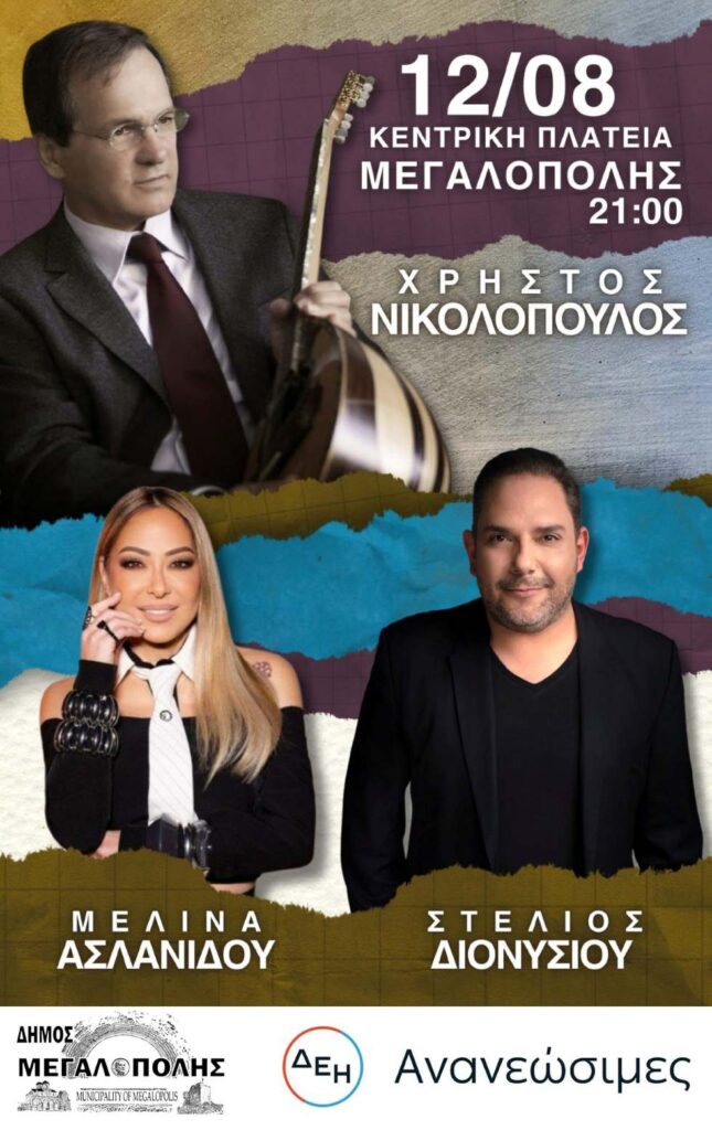 Μουσική συναυλία με τον Χρήστο Νικολόπουλο, Μελίνα Ασλανίδου και Στέλιο Διονυσίου στην Κεντρική πλατεία Μεγαλόπολης,