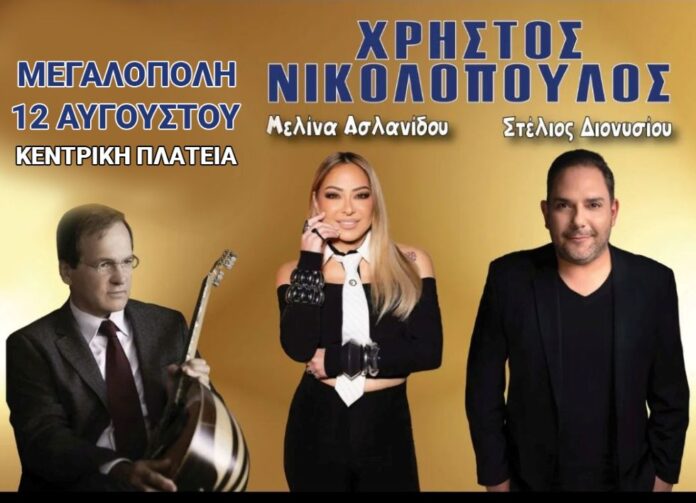 Μουσική συναυλία με τον Χρήστο Νικολόπουλο, Μελίνα Ασλανίδου και Στέλιο Διονυσίου στην Κεντρική πλατεία Μεγαλόπολης,