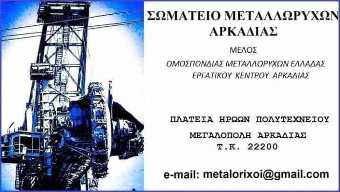 Το Σωματείο Μεταλλωρύχων Αρκαδίας καλεί τους εργαζόμενους, τους κατοίκους της Μεγαλόπολης, καθώς και κάθε κοινωνικό φορέα να πάρουν μέρος στο Συλλαλητήριο στην κεντρική πλατεία Μεγαλόπολης τη Δευτέρα 25 Νοεμβρίου στις 12:00 για να αποτρέψουμε