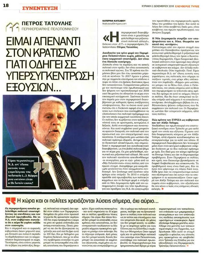 Βασικά θέματα που ανέπτυξε ο Περιφερειάρχης Πελοποννήσου Πέτρος Τατούλης στην συνέντευξη του στον Ελέυθερο Τύπο της Κυριακής 2/12/2019: