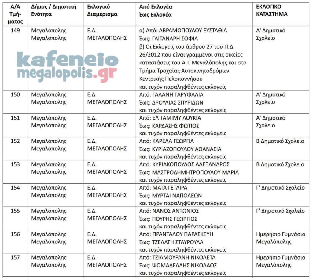 Για την πόλη της Μεγαλόπολης υπάρχουν 9 εκλογικά τμήματα , δείτε με βάση το επώνυμο σας που ψηφίζετε, όπως εμφανίζονται στον πίνακα που ακολουθεί: