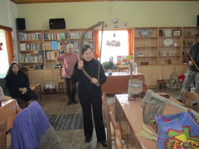 Στη συνέχεια, στην αίθουσα του Συλλόγου στ’ Αλώνια, η κ. Κατερίνα Παν. Χαρίτου με απλό και κατανοητό τρόπο, μίλησε στους μαθητές για τα διάφορα αντικείμενα και εργαλεία που χρησιμοποιούσαν οι ντόπιοι τα παλιά χρόνια, για να μαγειρεύουν, να καλλιεργούν τη γη τους και να περιποιούνται τα ζωντανά τους.