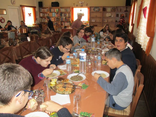 Τα παιδιά γεύτηκαν τα παραδοσιακά φαγητά (βραστό με τραχανά σούπα, χορτόπιτα, τραχανόπιτα και φασόλια μαυρομάτικα με άγρια χόρτα) που ετοίμασαν η κ. Κατερίνα Π. Χαρίτου, η Πρόεδρός μας Μαρία Λαγούδη-Καλομάλου και το Μέλος του Δ.Σ. Τάκης Παπαδημητρίου, ενώ φεύγοντας πήραν μαζί τους τα εύγευστα σάντουϊτς που προσέφερε το καφέ «Ροντώ» της Μεγαλόπολης.