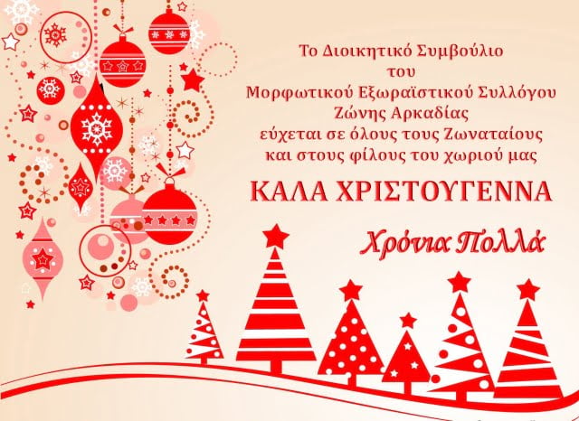 – Τα Μέλη του Διοικητικού Συμβουλίου του Μορφωτικού Εξωραϊστικού Συλλόγου Ζώνης, εύχονται στα Μέλη του Σωματείου μας, στους συμπατριώτες και στους φίλους του χωριού μας και του Συλλόγου μας, ΚΑΛΑ ΧΡΙΣΤΟΥΓΕΝΝΑ και ΧΡΟΝΙΑ ΠΟΛΛΑ.