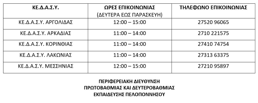 Επίσης, ανακοινώνεται ότι, σε κάθε Κέντρο Διεπιστημονικής Αξιολόγησης, Συμβουλευτικής και Υποστήριξης  (ΚΕ.Δ.Α.Σ.Υ.) της Π.Δ.Ε. Πελοποννήσου, λειτουργεί Τηλεφωνική Γραμμή Ψυχολογικής Υποστήριξης και Ενημέρωσης, στην οποία μπορούν να απευθύνονται οι υποψήφιοι/ες και οι οικογένειές τους.