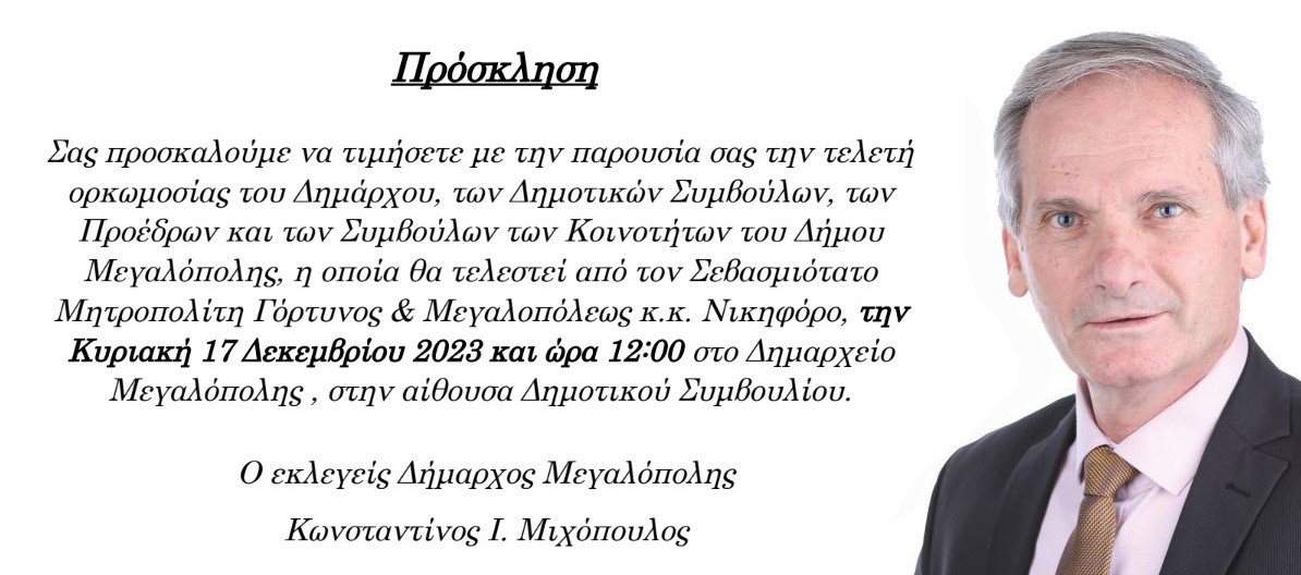 Σας προσκαλούμε να τιμήσετε με την παρουσία σας την τελετή ορκωμοσίας του Δημάρχου, των Δημοτικών Συμβούλων, των Προέδρων και των Συμβούλων των Κοινοτήτων του Δήμου Μεγαλόπολης, η οποία θα τελεστεί από τον Σεβασμιότατο Μητροπολίτη Γόρτυνος & Μεγαλοπόλεως κ.κ. Νικηφόρο, την Κυριακή 17 Δεκεμβρίου 2023 και ώρα 12:00 στο Δημαρχείο Μεγαλόπολης , στην αίθουσα Δημοτικού Συμβουλίου.