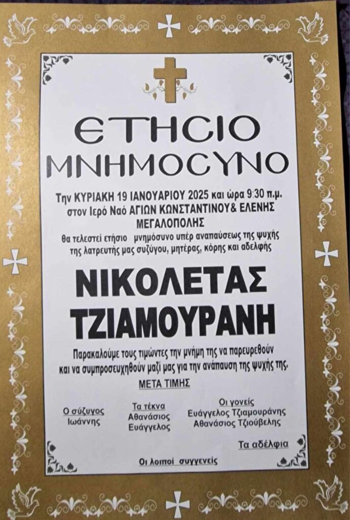Την Κυριακή 19 Ιανουαρίου στον Ιερό Ναό Αγίου Κωνσταντίνου & Ελένης , θα τελεστεί το ετήσιο μνημόσυνο της Νίκης Τζιαμουράνη