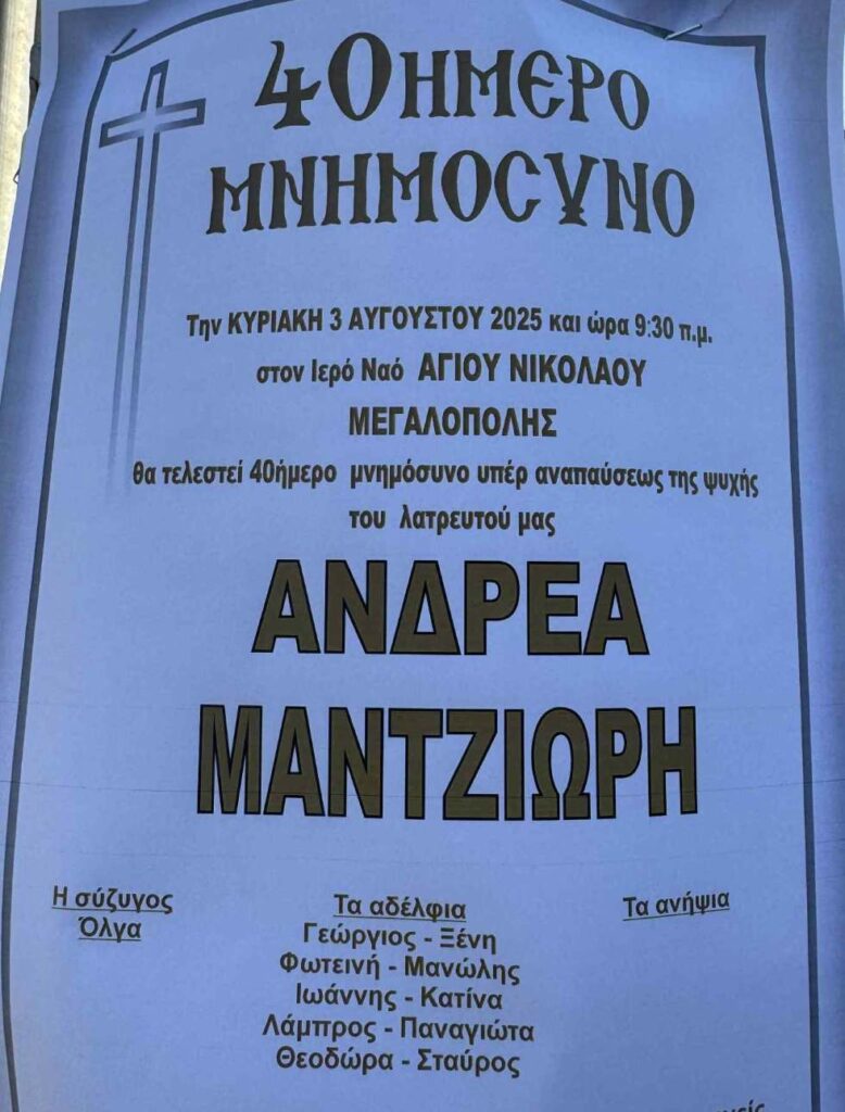 Την Κυριακή 3 Αυγούστου και ώρα 09:30 στον Ιερό Ναό Αγίου Νικολάου Μεγαλόπολης, θα τελεστεί το 40ήμερο μνημόσυνο υπέρ της αναπάυσεως της ψυχής του λατρευτού μας Ανδρέα Μαντζιώρη,