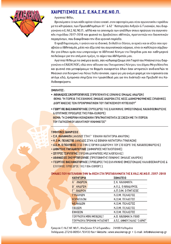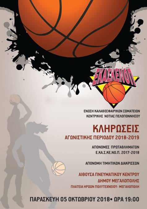 Την Παρασκευή 5 Οκτωβρίου 2018 στις 7 μ.μ. θα πραγματοποιηθεί η ετήσια γιορτή του μπάσκετ της ΕΚΑΣΚΕΝΟΠ στην αίθουσα του Πνευματικού Κέντρου του Δήμου Μεγαλόπολης (Πλατεία Ηρώων Πολυτεχνείου), στην οποία κεντρικοί ομιλητές θα είναι: