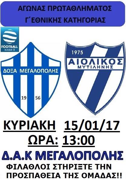 Την Κυριακή 15 Ιανουαρίου θα γίνει ο αγώνας Δόξα Μεγαλόπολης – Αιολικός στο Δ.Α.Κ. Μεγαλόπολης με ώρα έναρξης 13:00.