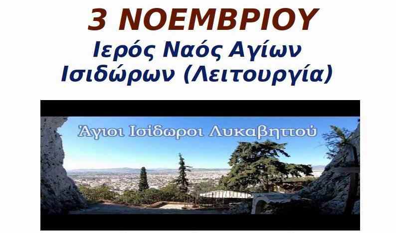 3 Νοεμβρίου- Κυριακή: Ημερήσια εκδρομή στην Αθήνα. Θεία Λειτουργία στον Ιερό Ναό των Αγίων Ισιδώρων Λυκαβηττού. Ελεύθερος χρόνος για καφέ. Το απόγευμα επίσκεψη στην Ιερά Μονή Παναγίας Γοργοεπήκοου στη Μάνδρα.