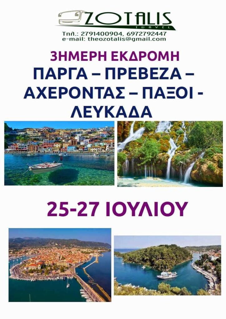 - 25-27/7/21: Τριήμερη εκδρομή στη Πάργα – Πρέβεζα – Αχέροντα -Παξοί – Λευκάδα -Νυδρί.