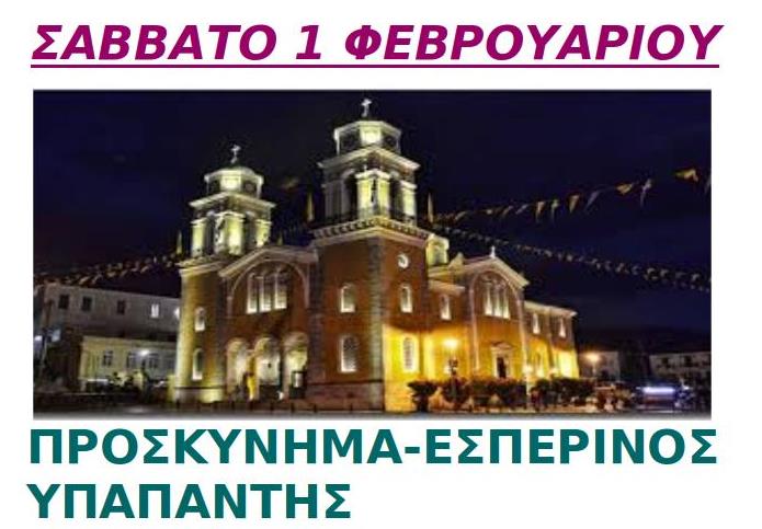 1/2/20 – Σάββατο:Απογευματινή επίσκεψη στην Εορτάζουσα Καλαμάτα για προσκύνημα & Εσπερινό της Υπαπαντής. Ελεύθερος χρόνος για καφέ και βόλτα.