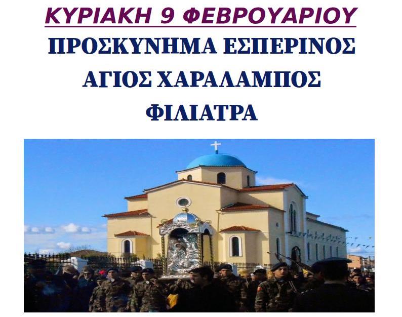 9/2/20 -Κυριακή:Απογευματινή επίσκεψη στα Φιλιατρά για τον Εσπερινό Μνήμης του Άγιου Χαράλαμπου. Ελεύθερος χρόνος για καφέ και βόλτα στην εμποροπανήγυρη.