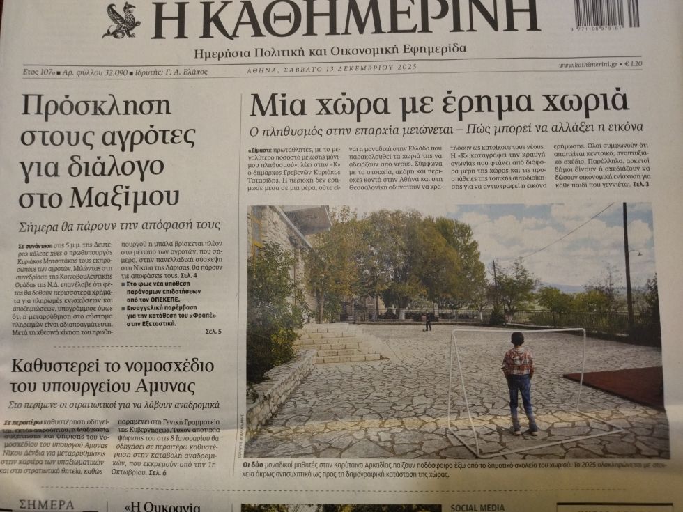 Συνημμένη η πρώτη σελίδα της σημερινής ΚΑΘΗΜΕΡΙΝΗΣ (13 Δεκεμβρίου 2025) με κύριο άρθρο: