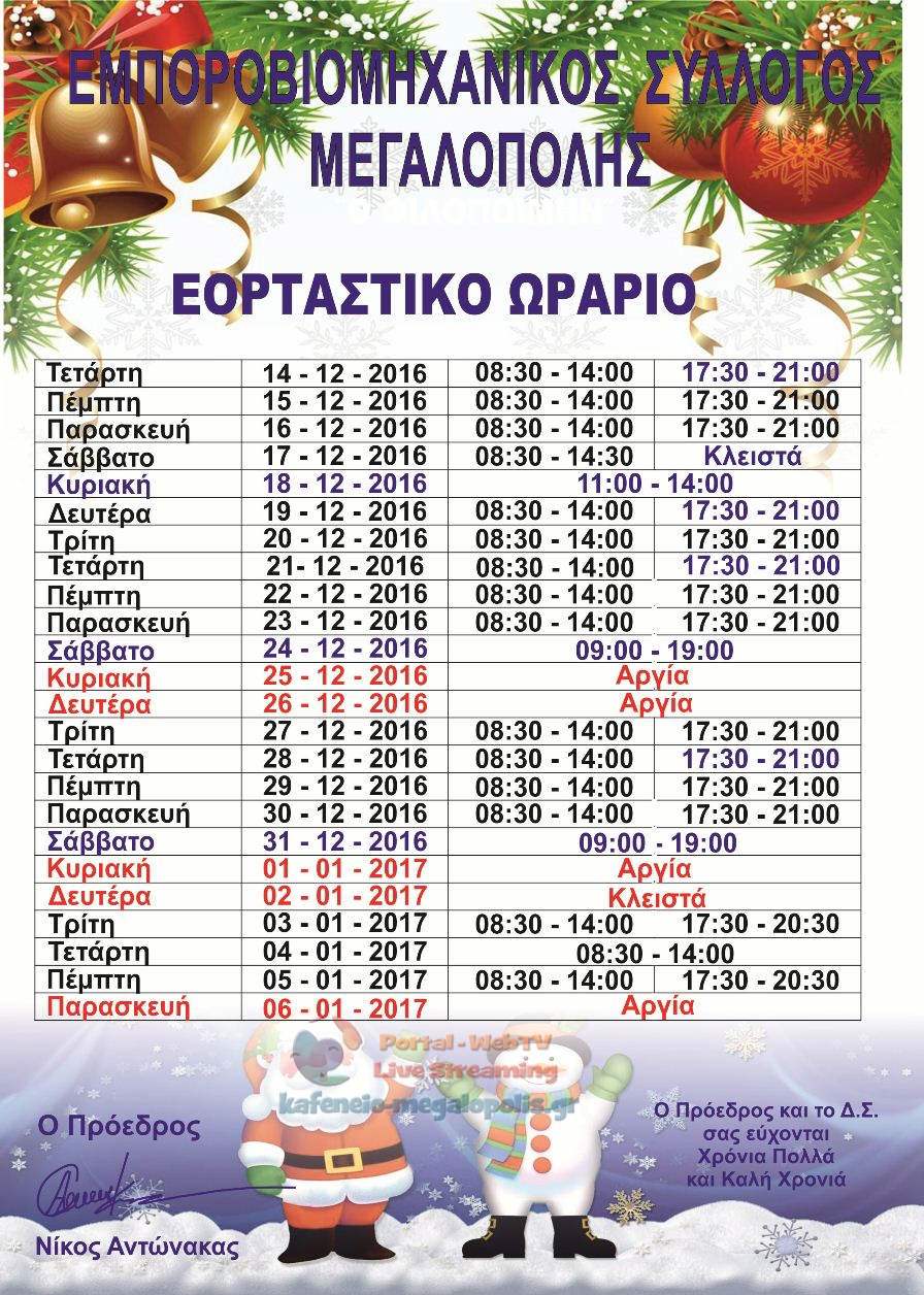 Το εορταστικό ωράριο των καταστημάτων στην Μεγαλόπολη, από την Τετάρτη 14 Δεκεμβρίου έως την Παρασκευή 6 Ιανουαρίου έχει ως εξής: