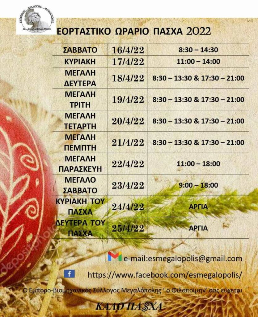 Το προτεινόμενο ωράριο λειτουργίας καταστημάτων, για την περίοδο των εορτών του Πάσχα με την δυνατότητα εκτύπωσής του από την φωτογραφία που ακολουθεί και επίσης θα διανέμεται σε έντυπη μορφή και στο κατάστημα του γραμματέα του συλλόγου ‘ Επιλογή’ Παπαναστασίου 18, Μεγαλόπολη.