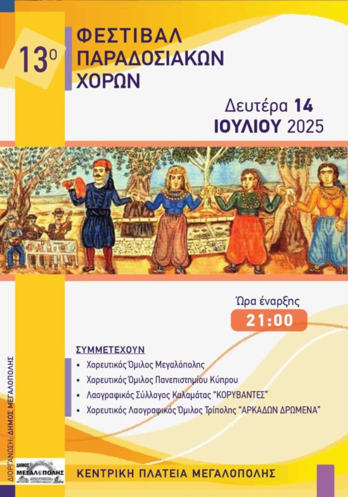 Την Δευτέρα 14 Ιουλίου θα πραγματοποιηθεί στην Κεντρική πλατεία Μεγαλόπολης το 13ο Φεστιβάλ Παραδοσιακών Χορών .