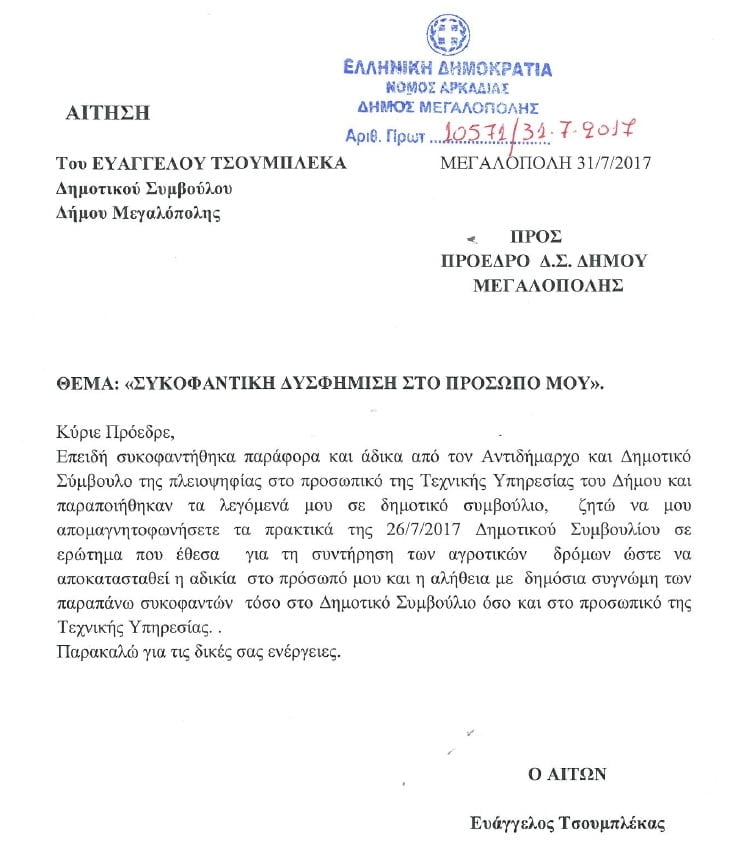 Με την αίτηση του αυτή ο κ. Τσουμπλέκας ζητάει τα πρακτικά από συγκεκριμένη συζήτηση , επειδή όπως αναφέρει έχει γίνει συκοφαντική δυσφήμιση στο πρόσωπο του από τον αντιδήμαρχο τεχνικών υπηρεσιών του Δήμου.
