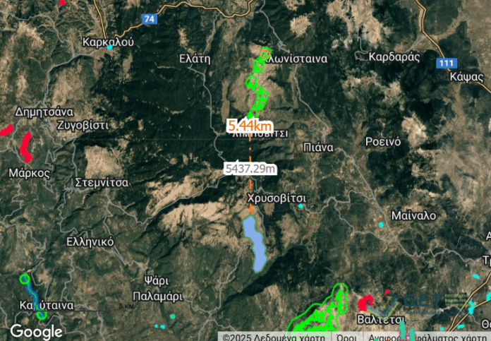 Στην εικόνα από το Γεωπληροφοριακό Χάρτη της ΡΑΑΕΥ βλέπουμε την απόσταση που έχει το υπό διαβούλευση υβριδικό αιολικό εργοστάσιο από το αιολικό με μπαταρίες της Αιολικής Θεοδώρων (θυγατρική του γαλλικού κολοσσού EDF) στο Νότιο Μαίναλο. Οδηγίες πλοήγησης στον εν λόγω Χάρτη εδώ