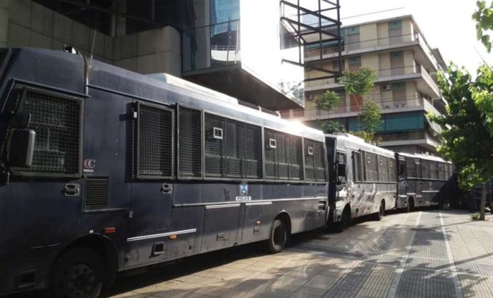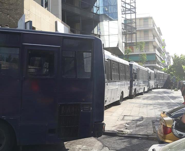 Έξω από το κτίριο έχουν λάβει θέσεις ισχυρές αστυνομικές δυνάμεις και πάνω από 20 κλούβες έχουν κυριολεκτικά απομονώσει την πρόσβαση στο Υπουργείο, για να εμποδίσουν του συνδικαλιστές και τους εργαζόμενους της ΔΕΗ να κάνουν την παρέμβαση που έχουν αποφασίσει.