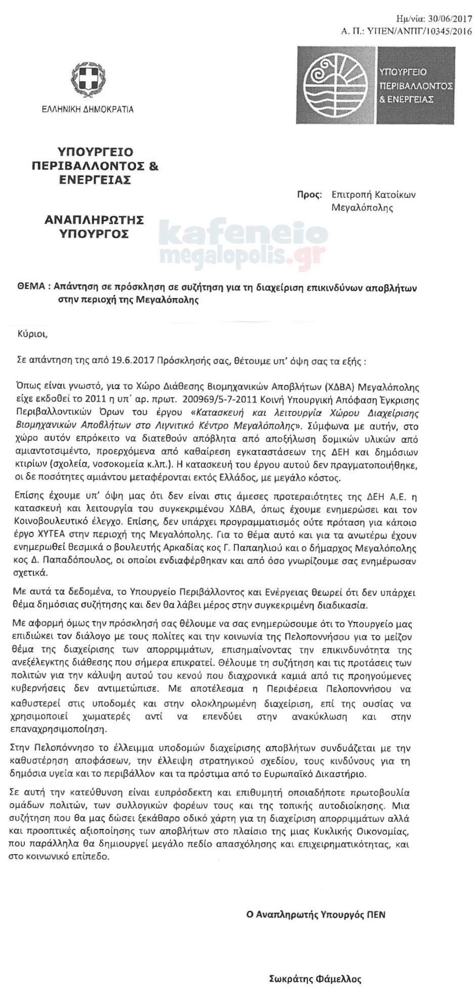 Ο υπουργός συνέχισε λέγοντας: Μάλιστα μπορώ να σας δώσω την επιστολή που έστειλα στους κατοίκους της Μεγαλόπολης στις 30 Ιουνίου 2017,την οποία έχω κοινοποιήσει και στον Δήμαρχο και στον Βουλευτή της περιοχής και αναφέρει μέσα τα ίδια πράγματα.