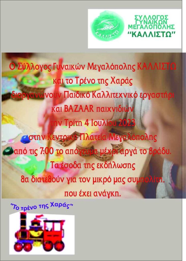 Την Τρίτη 4 Ιουλίου, στην πλατεία της Μεγαλόπολης από τις 19:00, θα λειτουργήσει καλλιτεχνικό εργαστήρι και bazaar παιχνιδιών.