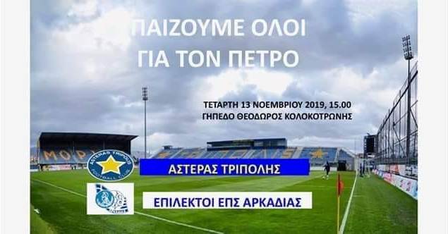 Η Ε.Π.Σ. Αρκαδίας και ο «Αστέρας» Τρίπολης, μετά από παρότρυνση της «Δόξας» Μεγαλόπολης, στην προσπάθειά τους να συνδράμουν οικονομικά, ηθικά και ψυχολογικά στην προσπάθεια της οικογένειας του 17χρονου Πέτρου από τη Μεγαλόπολη ο οποίος πάσχει από καρδιακή ανεπάρκεια, διοργανώνουν την προσεχή Τετάρτη 13 Νοεμβρίου και ώρα 15:00, ποδοσφαιρικό αγώνα στο γήπεδο του «Αστέρα».