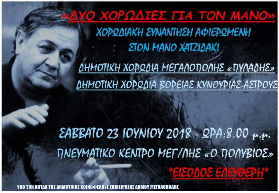 Χορωδιακή συνάντηση αφιερωμένη στον Μάνο Χατζηδάκι το Σάββατο 23 Ιουνίου στην Μεγαλόπολη